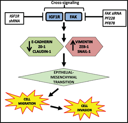 Multiple studies have implicated a role for IGF1R in breast cancer, including TNBC, and other malignancies; however, the specific molecular mechanisms underlying IGF1R’s involvement in TNBC are not fully understood. Our present study identifies a novel role for IGF1R signaling in the regulation of EMT and provides new insight into the downstream processes regulated by IGF1R in TNBC cells. This study is the first to show the cooperative effect of IGF1R and FAK signals in promoting malignant behaviors of TNBC cells. We propose a model of IGF1R/FAK crosstalk as one possible mechanism for regulating EMT, motility, and invasion in TNBC cells (Figure 7). A major finding from our study is that FAK-dependent IGF1R signaling is critical for maintaining mesenchymal morphologies and potentiating cell migration and invasion in TNBC cells. We found that inhibition of IGF1R induces changes resembling MET and decreases invasiveness in mesenchymal TNBC cells as evidenced by increased E-cadherin and decreased vimentin, ZEB1, and pFAK expression. Additionally, down-regulation of IGF1R significantly reduced colony number, invasive ability, and motility of TNBC cells, and ectopic expression of IGF1R produced opposite results.