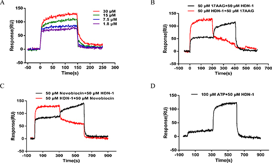 Figure 2: Interaction of HDN-1 with Hsp90 immobilized on a GLH sensor chip in the absence and presence of 17-AAG, novobiocin, and ATP. The binding RU was recorded as binding potency. (A) HDN-1 binding to full length Hsp90α. Various concentrations (1.8–30 μM) of HDN-1 were injected into Hsp90α-immobilized chip, and RU values were recorded. (B) The interplay of 17-AAG (50 μM) and HDN-1 (50 μM) on binding to Hsp90α. Black line: 50 μM 17-AAG was injected onto Hsp90α-immobilized chip and the RU values were recorded in succession. 50 μM 17-AAG was replaced by 50 μM HDN-1 200 seconds after the injection, and RU values were recorded unceasingly. Red line: 50 μM HDN-1 was first injected onto Hsp90α-immobilized chip and was replaced by 50 μM 17-AAG 200 seconds after the first injection. (C) The interplay of novobocin and HDN-1 on binding to Hsp90α. Black line: 50 μM novobocin was injected onto Hsp90α-immobilized chip and RU values were recorded in succession. novobocin was replaced by 50 μM HDN-1 300 seconds after novobocin injection, and RU values were recorded; Red line: 50 μM HDN-1 was first injected into Hsp90α-immobilized chip and was replaced by 50 μM novobocin 300 seconds after HDN-1 injection. (D) The ATP did not affect the HDN-1's binding to Hsp90α. 100 μM ATP was injected into Hsp90α-immobilized chip, and RU values were recorded, and was replaced by 50 μM HDN-1300 seconds after ATP injection.