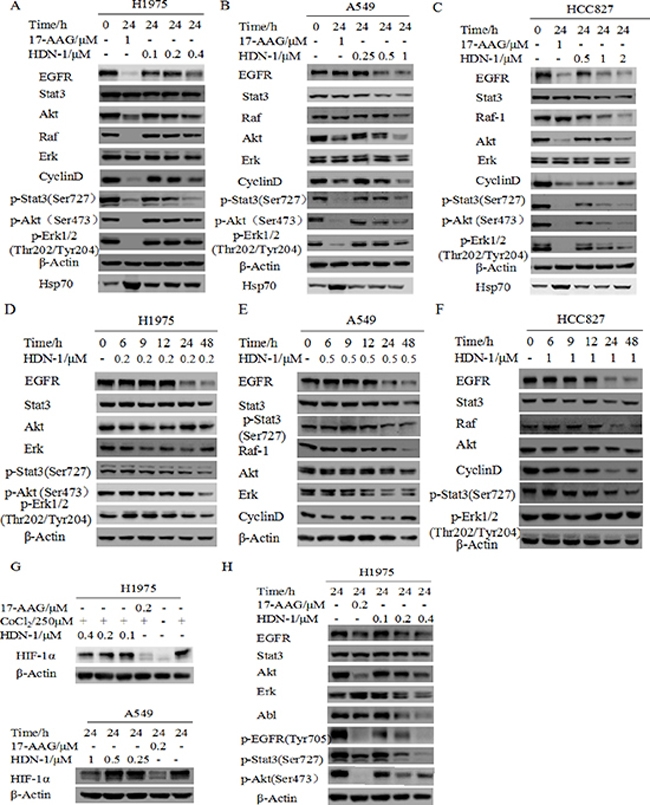 Figure 4: HDN-1 induces degradation of multiple oncoproteins. HDN-1 treatment induced degradation of Hsp90 client proteins in H1975 cells (A, D), A549 cells (B, E) and HCC827 (C, F) in dosage- and time-dependent manners. Cells were incubated with HDN-1 at indicated concentrations and time, and then subjected to Western blotting assay with indicated antibodies. (G) HDN-1 induced degradation of HIF-1α in H1975 and A549 cells under hypoxic condition. Cells were incubated with HDN-1 at indicated concentrations in the presence of 250 μM CoCl2 or cultured in low oxygen condition (5% CO2 and 2% O2). (H) The sensitivity of different Hsp90 client proteins to HDN-1 or 17-AAG treatment in H1975 cells. Cells were incubated with HDN-1 or 17-AAG at indicated concentrations, and then analyzed by Western blotting.