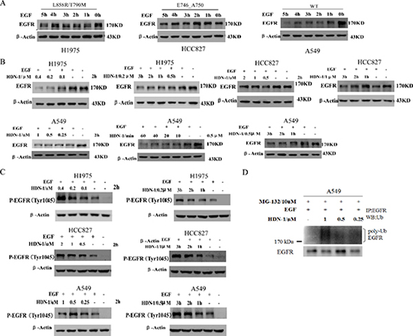 Figure 5: HDN-1 promotes EGF-induced EGFR downregulation. (A) EGFR mutants in H1975 and HCC827 cells were resistant to be degraded upon EGF treatment. A549, H1975 or HCC827 cells were cultured overnight with serum free medium and incubated with 25 ng/ml EGF at indicated time. EGFR expression was determined by Western blotting assay. (B, C) HDN-1 promoted the reduction of EGFR expression and upregulation of EGFR Tyr1045 phosphorylation upon EGF stimulation in A549, H1975 and HCC827 cells. A549, H1975 or HCC827 cells were incubated with HDN-1 at indicated concentrations and time in the presence of 25 ng/ml EGF. EGFR and EGFR pY1045 were determined by Western blotting assay. (D) HDN-1 increased the level of EGFR ubiquitination in A549 cell. A549 cells were pretreated with 10 μM MG132 for 1 h, and then incubated with HDN-1 at indicated concentrations in the presence with 25 ng/ml EGF for 30 min. The levels of EGFR ubiquitination were detected by an antibody for ubiquitin.