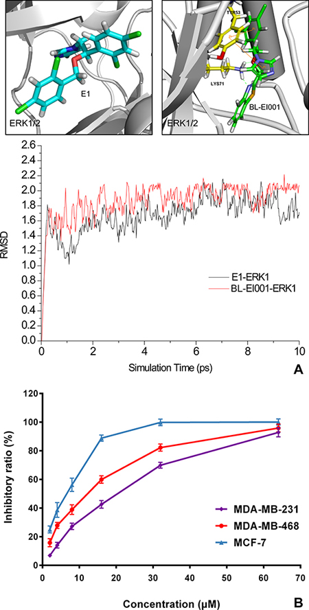 Figure 3: Molecular dynamics (MD) simulation and anti-proliferative activities of E1 and BL-EI001. (A) Comparison of molecular dynamics simulation between E1 and BL-EI001 binding to ERK1/2; (B) Comparison of anti-proliferative effects between E1 and BL-EI001 in CF-7 cells, MDA-MB468 cells and MDA-MB231 cells, respectively.