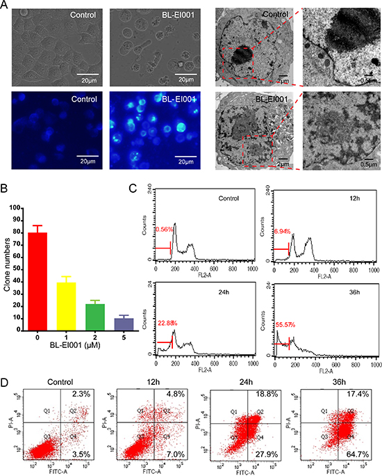 Figure 4: BL-EI001 induces MCF-7 cell apoptosis. (A) The cellular morphology was observed without or with BL-EI001 under the inverted, fluorescent microscopy and electron microscopy, respectively; (B) Cells were consecutively treated with indicated concentrations of BL-EI001 for two weeks. Cell proliferation was examined by colony formation assay; (C) The population of SubG1 cells was measured by flow cytometry after collection; (D) Apoptosis was detected via Annexin V-FITC/PI staining in MCF-7 cells treated with BL-EI001 for 12, 24, 36 h by flow cytometry analysis.