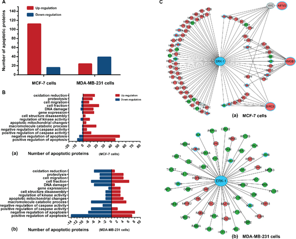 Figure 6: Proteomics analyses of BL-EI001-induced apoptosis in breast cancer cells. (A) Different protein levels (upregulation or downregulation) between control and BL-EI001-treated MCF-7 and MDA-MB231 cells; (B) Apoptosis-related enrichment analyses in BL-EI001-treated MCF-7 and MDA-MB231 cells; (C) Proteomics-based identification of novel ERK apoptotic pathways in BL-EI001-treated MCF-7 and MDA-MB231 cells.