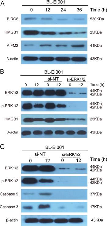 Figure 7: BL-EI001-induced apoptosis is regulated by novel ERK-mediated pathways. (A) BL-EI001-induced apoptosis is associated with BRIC6, HMGB1 and AIFM2; (B) BL-EI001-induced apoptosis is regulated by ERK1/2-HMGB1 pathway; (C) BL-EI001-induced apoptosis is affecting ERK1/2.