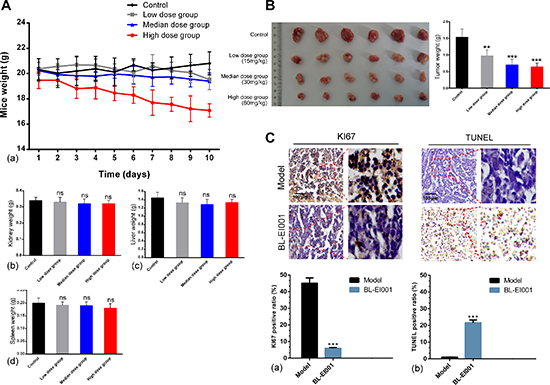 Figure 8: Anti-tumor effects of BL-EI001 in vivo. (A) The toxicity of BL-EI001 in breast cancer xenograft mouse model; (B) Illustration shows the tumor excised from each treatment group and data represent the mean tumor weight for each group; (C) Immunohistochemistry of proliferative marker KI67 and TUNEL assay.