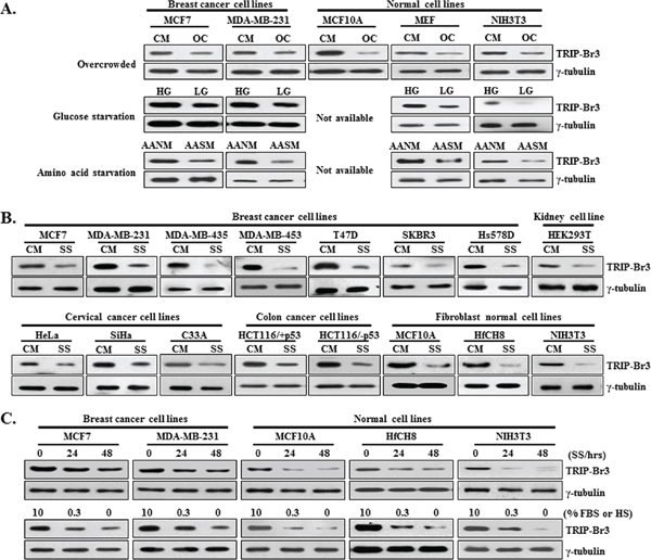 Figure 1: TRIP-Br3 expression levels in cancer and normal cell lines under the stressful condition of nutrient deficiency. (A) TRIP-Br3 expression levels in breast cancer and normal cell lines under the stressful conditions of nutrient deficiency (overcrowded environment and depletion of glucose or amino acid). Cells were cultured in complete medium until cells reached ~70% confluence (CM) or overcrowded with high levels of cell confluence by culturing in a complete medium for long time (OC). Each cell line was grown in high (HG) or low (LG) levels of glucose containing medium. Cells were also cultured in sufficient amino acid containing normal medium (AANM) or amino acid starved EBSS minimal medium (AASM). (B) Cancer and normal cell lines were grown in serum containing complete medium (CM) or serum starved medium (SS). (C) Expression levels of TRIP-Br3 in response to serum depletion were measured in time- or concentration-dependent manner.