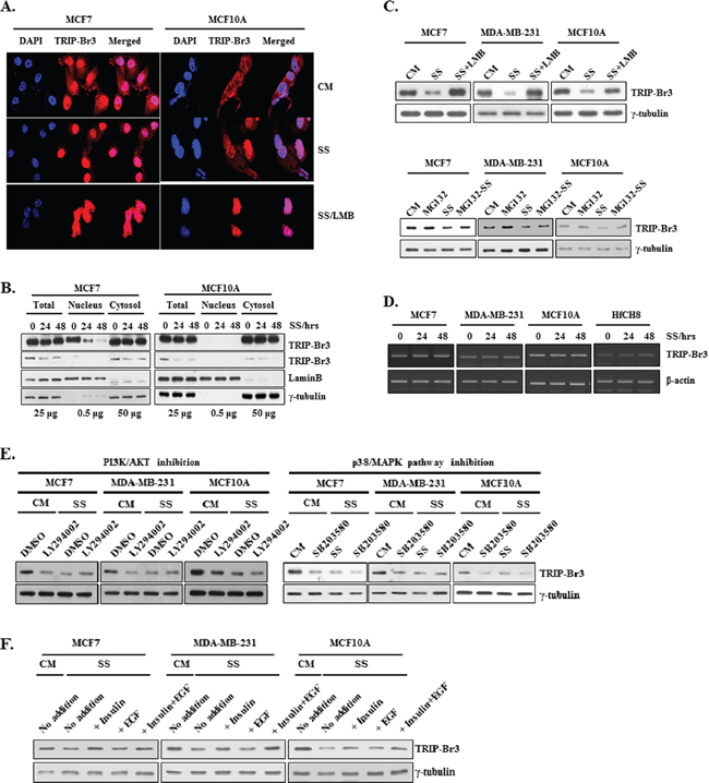 Figure 2: Change of TRIP-Br3 expression level in different sub-cellular localizations under serum starvation. (A) MCF7 and MCF10A cells were grown in media with or without serum for 48 h. Resulting cells were prepared for immunofluorescence and TRIP-Br3 localization was detected by using confocal microscopy. (B) Analysis of TRIP-Br3 location by nuclear fractionation in response to serum starvation for indicated times. Lamin B and γ-tubulin were used as nuclear marker or a loading control, respectively. Loaded amount of proteins are numbered. (C) Cells were grown in complete (CM) or serum starved (SS) medium in the absence or presence of 10 ng/ml of LMB for 36 h or 0.1 μM of MG132 for 20 h. Resulting cells were subjected to Western blot analysis. (D) TRIP-Br3 gene expression level was checked at the transcriptional level by employing RT-PCR. It was performed after indicated cells were subjected to serum containing complete medium (CM) or serum starved condition (SS) for 12 h or 24 h as mentioned in Materials and Methods. (E) Effect of PI3K/AKT and p38/MAPK on TRIP-Br3 expression under the condition of serum deficiency. Each cell line was grown in DMEM or DMEM/F12 with or without 50 μM of LY294002 or 20 μM of SB203580 for 24–48 h in the complete (CM) or serum starved (SS) media. (F) Cells were grown in DMEM or DMEM/F12 in the presence or absence of 20 μg/ml of insulin and/or 50 μM of EGF for 48 h in the complete (CM) or serum starved (SS) media.