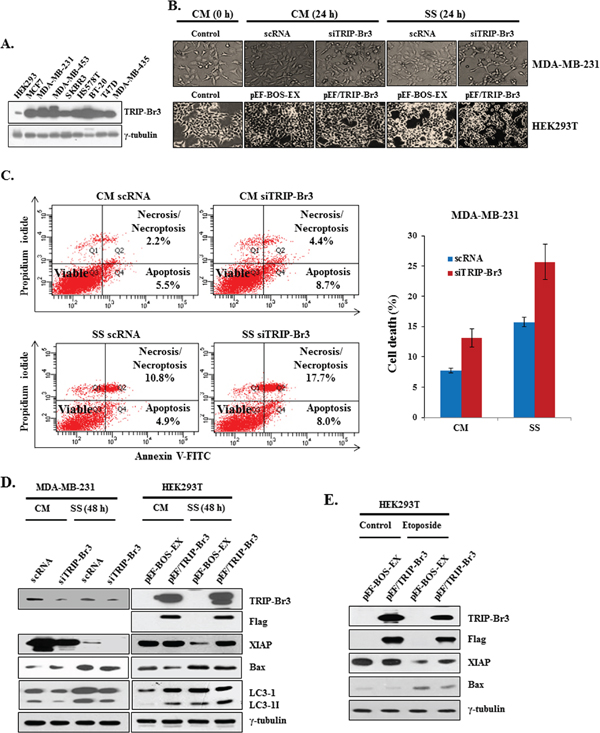 Figure 3: Inhibitory role of TRIP-Br3 in serum depletion induced cell death. (A) Different expression levels of TRIP-Br3 gene in nine cancer cell lines. B, C, D, and E.TRIP-Br3 gene was overexpressed or suppressed by transiently transfecting with TRIP-Br3 silencing RNAs (siTRIP-Br3) or TRIP-Br3 overexpressing plasmid (pEF/TRIP-Br3) with corresponding controls (scRNA or pEF-BOS-EX) as detailed in Materials and Methods. Transfected cells were then incubated in the complete (CM) or serum starved (SS) medium for the indicated times. Microscopic phenotypes of each cell line were photographed (B). Transfected MDA-MB-231 cells were harvested and stained with Annexin V-FITC/propidium iodide for Flow Cytometry Analysis to quantify the serum starvation induced cell death (C) Each protein level was checked using Western blot (D) HEK293T cells were transfected with TRIP-Br3 overexpressing plasmid (pEF/TRIP-Br3) and then treated with 20 μM of etoposide for 48 h (E).