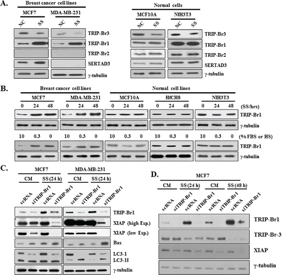 Figure 4: Positive effect of TRIP-Br1 on XIAP expression under serum depletion. (A) Expression levels of TRIP-Br1, 2, 3 and SERTAD3 proteins were checked in breast cancer and normal cells under the condition of serum deficiency. (B) Indicated cells were grown in complete or serum starved media for 24 h or 48 h and the protein levels of TRIP-Br1 were measured by using Western blot. Expression levels of TRIP-Br1 in response to serum depletion were measured in time- or concentration-dependent manner. (C) and (D). TRIP-Br1 genes were suppressed by transiently transfecting with TRIP-Br1 silencing RNAs (siTRIP-Br1) with scRNA control as detailed in Materials and Methods. Transfected cells were then incubated in the complete (CM) or serum starved (SS) medium for the indicated times.