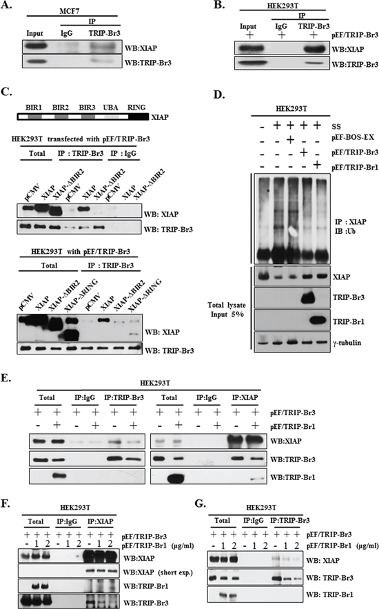 Figure 5: Positive effect of TRIP-Br3 and TRIP-Br1 on the XIAP stability during serum starvation and competitive interaction between TRIP-Br3 and TRIP-Br1 for the binding to XIAP. (A) Direct interaction between endogenous TRIP-Br3 and XIAP was analyzed by employing immunoprecipitation (IP) and Western blotting (WB) with either anti–TRIP-Br3 or anti-XIAP antibody after MCF7 cells were grown in normal complete medium and harvested at 90% confluence. (B) HEK293T cells were transfected with pEF/TRIP-Br3 plasmid and cell lysates were collected for immunoprecipitation analysis. (C) Direct interaction of TRIP-Br3 with XIAP through the BIR2 domain. Genomic structure of XIAP consisting of three major domains (three BIRs, UBA, and a zinc-finger RING) is shown. HEK293T cells transfected with pEF/TRIP-Br3 plasmid were co-transfected with control vector (pCMV), flag-tagged full length XIAP (XIAP), BIR2 domain deleted XIAP (XIAP-ΔBIR2), or RING domain deleted XIAP (XIAP-ΔRING). Resulting cells were subjected to Immunoprecipitation assay with anti-TRIP-Br3 antibody. (D) Ubiquitination assays were employed after HEK293T cells were transfected with pEF-BOS-EX control vector, pEF/TRIP-Br3, or pEF/TRIP-Br1 vector under normal or serum starved (SS) conditions for 42 h. Cell lysates were immunoprecipitated (IP) with anti-XIAP antibody and immunoblotted (IB) with anti-ubiquitin. The total lysates before immunoprecipitation (Input) and the immunoprecipitate supernatants were then subjected to immunoblotting analysis with corresponding antibodies. (E) HEK293T cells were transfected with pEF/TRIP-Br3 and/or pEF/TRIP-Br1 plasmid in complete media for 48 h and the cell lysates were collected for immunoprecipitation analysis. (F) and (G) HEK293T cells were co-transfected with pEF/TRIP-Br3 (1 μg/ml) and different concentrations of pEF/TRIP-Br1 plasmids (1 or 2 μg/ml) in complete media for 48 h and the cell lysates were collected for immunoprecipitation analysis. Direct interaction between TRIP-Br3 and XIAP was analyzed by employing immunoprecipitation (IP) with either anti–TRIP-Br3 or anti-XIAP antibodies.