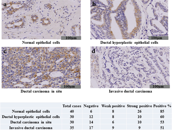 Figure 6: Immunohistochemical expression of TRIP-Br3 in breast tissues. Immunohistochemical assay was performed on the normal breast epithelial cells (A), ductal hyperplastic epithelial cells (B), ductal carcinoma in situ (C) or invasive ductal carcinoma (D) as indicated in Materials and Methods. Representative images are shown, in which weak or strong immune-reactivity against TRIP-Br3 are shown in brown color. Forty cases of normal breast tissue, thirty cases of ductal hyperplasia, thirty cases of ductal carcinoma in situ, and thirty five cases of invasive ductal carcinoma were tested for the TRIP-Br3 expression. The TRIP-Br3 expression was found in 85% (34/40) of normal breast tissue, 60% (18/30) of ductal hyperplasia, 53% (16/30) of ductal carcinoma in situ, and 51% (18/35) of invasive ductal carcinoma. The TRIP-Br3 expression was decreased in the invasive ductal carcinoma compared to the normal breast tissue with statistical significance by student t-test (p = 0.002).
