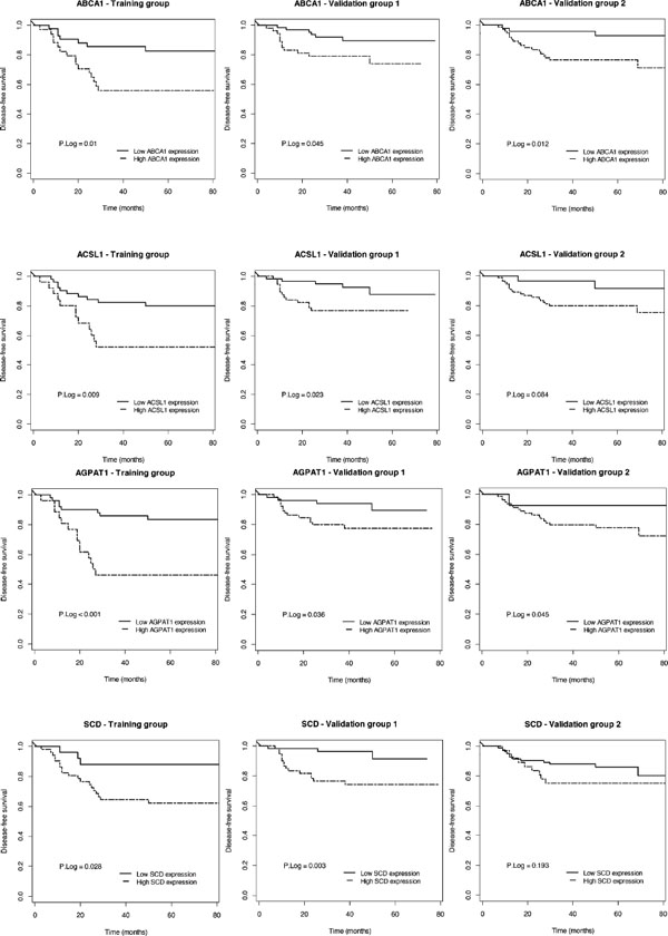 Figure 2: Prognostic value of individual genes constituting ColoLipidGene in the different group of patients. Kaplan-Meier plots for individual genes of ColoLipidGene and p Log Rank value in the training group and validation groups I and II are shown.