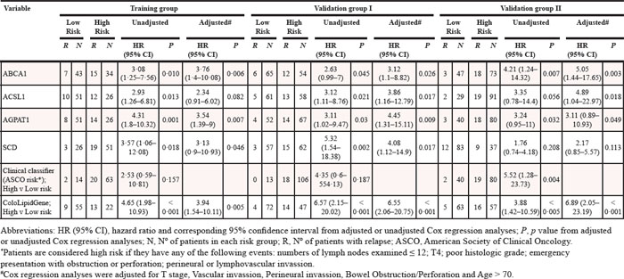 Table 4: Uni- and multivariate cox regression analysis for disease-free survival of ColoLipidGene signature and individual composing genes, and the clinical classifier (ASCO clinical risk criteria) in stage II CRC patients