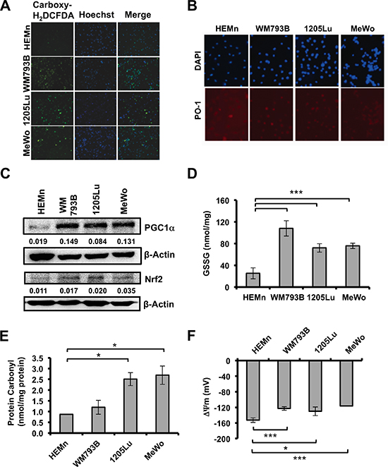 Figure 1: Basal ROS and oxidative stress markers in melanoma cells and melanocytes. (A) Fluorescent micrographs showing total intracellular ROS by carboxy-H2DCFDA, nuclear counterstain by Hoechst, and merged image in melanocytes (HEMn) and melanoma cells (WM793B, 1205Lu, MeWo) at 10X magnification. (B) Evaluation of basal H2O2-specific ROS by Peroxy Orange 1 (PO-1), 20X magnification. (C) Basal protein levels of PGC1α and NRF2 by western blotting. Quantification of band densitometry is shown below, relative to β-actin loading control. (D) Basal level of oxidized intracellular glutathione (GSSG; nmol/mg protein) determined using luminescence-based assay. (E) Intracellular protein carbonylation used as a measure of protein damage, determined by ELISA. (F) Mitochondrial membrane potentials (ΔΨ) were determined using Nernst equation derivative. Data are presented as means of three independent experiments. Statistical analysis was performed using Student's t-test. Significance values; *indicates p ≤ 0.05; and ***indicates p ≤ 0.001.