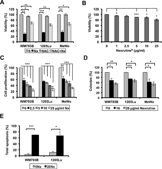 Figure 4: NexrutineR modulates melanoma cell growth homeostasis. (A) Effect of NexrutineR (10 μg/ml; 72 h) on melanoma cell viability (% of control) with and without NAC pre-treatment (5 mM; 1 h) determined by trypan blue exclusion assay. (B) Effect of NexrutineR on HEMn cell viability (live cells, % of control), determined by trypan blue exclusion assay. (C) Effect of increasing concentrations of NexrutineR on cell proliferation, percentage calculated based on vehicle treated controls. (D) NexrutineR inhibits soft-agar colony formation in melanoma cells. Percent colonies based on fluorescence values, normalized to vehicle controls. (E) Effect of NexrutineR (0, 20 μg/ml; 24 h) on melanoma cell apoptosis, determined using Annexin-APC and FACS. Significance values; *indicates p ≤ 0.05; **indicates p ≤ 0.01 and ***indicates p ≤ 0.001.