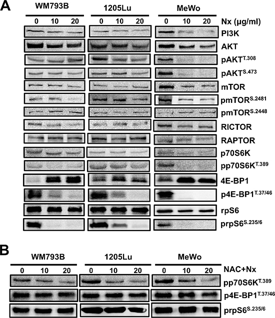 Figure 5: NexrutineR inhibits PI3K/AKT/mTOR signaling through oxidative stress modulation. (A) Effect of increasing doses of NexrutineR treatment for 18 h on total and phospho-protein levels of the PI3K/AKT/mTOR pathway in WM793B, 1205Lu, and MeWo cells, determined by western blotting. β-actin was used as a loading control for each blot. The image is a representative of a minimum of 3 independent experiments. (B) Abrogation of inhibitory effect of NexrutineR on proteins downstream of mTORC1 with NAC pre-treatment (5 mM; 1 h). β-actin was used as a loading control for each blot.