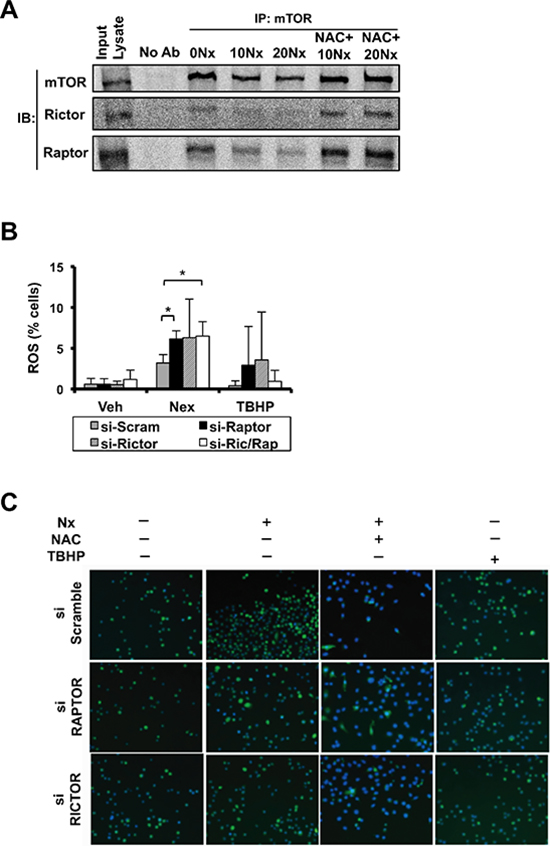 Figure 6: NexrutineR induces oxidative stress and inhibits mTOR signaling in a RAPTOR/RICTOR-independent manner. (A) Effect of NexrutineR (vehicle, 10, 20 μg/ml; 18 h) and NAC pre-treatment (5 mM; 1 h) on disruption of mTOR complex 1 and 2 formation in 1205Lu cells by co-IP using mTOR antibody followed by western blotting with anti-RICTOR, anti-RAPTOR, and anti-mTOR (1:1000) antibodies. 1205Lu whole cell lysate used as input control and pull-down with no antibody as negative control. (B) Evaluation of total ROS (% cells) in 1205Lu cells following NexrutineR treatment (10 μg/ml; 18 h), after transient transfection with siRNA targeting RAPTOR, RICTOR, or both RAPTOR and RICTOR. TBHP is the positive control for ROS induction. (C) Evaluation of total ROS by fluorescence microscopy (carboxy-H2DCFDA) following NexrutineR treatment (10 μg/ml; 18 h) and with NAC pre-treatment (5 mM; 1 h) in 1205Lu cells after transient transfection with siRNA targeting RAPTOR and RICTOR. TBHP is the positive control for ROS induction. Representative images of 3 independent experiments are shown. Significance values; *indicates p ≤ 0.05.