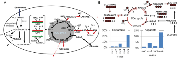 A glutamine requirement for the proliferation of many cell types is well established [4, 5] and certain tumor or oncogene-modified cell lines undergo apoptosis when deprived of glutamine [6–8]. The metabolism of glutamine begins by its conversion to glutamate by glutaminase, or other amidases which have various functions in biosynthetic pathways [9]. Deamination of glutamate yields α-ketoglutarate, an intermediate in the TCA cycle, and thereby glutamine acts as an anaplerotic substrate [10], contributing to the maintenance of pools of carboxylic acids in the TCA cycle and sustaining cellular oxidative phosphorylation (Figure 1A). This use of glutamine as an energy substrate is known as glutaminolysis, by analogy to glycolysis [11]. Additionally, the carbon contributed to the TCA cycle by glutamine can be used in biosynthetic reactions [12] (Figure 1A), and the processes of glutaminolysis and biosynthesis can run in parallel. Anaplerosis and cataplerosis (green and red arrows respectively in Figure 1A) must be balanced to maintain the TCA cycle in equilibrium [13]. Studies on tumor cells using 13C-glutamine have confirmed the use of glutamine as an anaplerotic substrate [3, 14–18], and have outlined some of the cataplerotic roles of carbon derived from glutamine, including use for fatty acid synthesis under hypoxia [3, 19–21] and export from the mitochondrion as aspartate and generation of NADPH (which maintains cellular redox state) via malic enzyme activity [16]. It is also well known that tumor or normal cells fed with glutamine will secrete glutamate [22, 23], and the secretion of some partially-13C glutamate from cells labeled with universally-13C-glutamine, which indicates TCA cycle-origin (Figure 1B), has been reported [15]. Glutamate derived from the TCA cycle contributes to cataplerosis and therefore provides a potential route for loss of TCA cycle metabolites, a process which has been observed in glutamine-starved cells undergoing apoptosis [6].