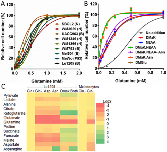 We tested the glutamine dependence of nine melanoma lines with different oncogenic drivers (4 mutant BRAF, 4 mutant NRAS, 1 mutant p53). All required at least 1 mM glutamine for maximal growth (Figure 2A) and there was no proliferation in the absence of glutamine (Figure S1A, S1B), while most cell lines could grow in the absence of glucose (Figure S1C). In contrast, growth of melanocytes was similar with or without glutamine (Figure S1D). As melanocytes were grown in a melanocyte-specific medium, we checked growth of Lu1205 melanoma cells in this medium and confirmed that growth was substantially inhibited by the absence of glutamine (Figure S1E).