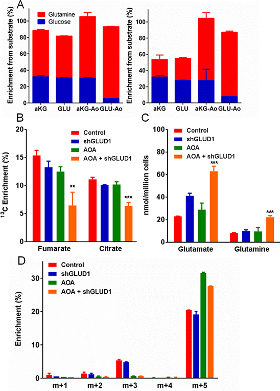 Figure 4: Testing the metabolic functions of aminotransferases and glutamate dehydrogenase (GLUD1) in Lu1205 cells. (A) Comparative enrichment of α-ketoglutarate or glutamate from glucose or glutamine in Lu1205 cells (left panel) or melanocytes (right panel) ± 0.5 mM AOA. (B–D) Effects of combined AOA treatment and GLUD1 knockdown on metabolism and growth. (B) Labeling of TCA cycle metabolites fumarate and citrate from 13C-glutamine. (C) Quantities of cellular free glutamate and glutamine. (D) Mass distribution of secreted glutamate (corrected for natural labeling and 13C-glutamine impurity). (Mean ± SEM of N = 3 for all, except mean ± range of N = 2 for D). **p < 0.05, ***p < 0.01 by Student’s unpaired t-test.