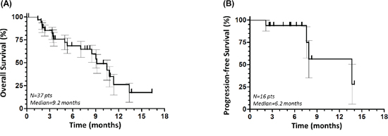 We obtained complete response in three (10.3%) and partial response in four (13.8%) out of 29 evaluable patients, whilst 16 (55.2%) and six (20.7%) patients had stable disease or progressive disease, respectively. The overall objective response rate and disease control rate were 19% (95% CI, 8%–30%) and 62% (95% CI, 55%–69%), respectively, and the median duration of response was 8 months (range 1–9 months). The median overall progression-free survival (PFS) and OS were 6.2 and 9.2 months, respectively (Figure 1A–1B). The grade (G) 3–4 dose-limiting toxicity were neutropenia in six (20.7%), severe anemia in five (17.2%), thrombocytopenia in two (6.9%), signs and symptoms of neurological and cardiovascular toxicity in three (10.3%) and one (3.4%) patients, respectively. One more patient (3.4%) complained of fatigue. Eight (21.6%) patients were not evaluable for early suspension.