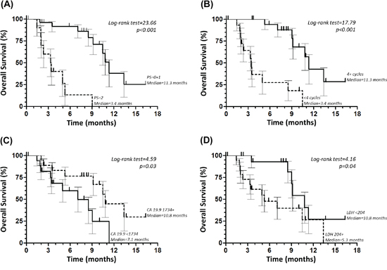 Figure 2: Overall survival according to Eastern Cooperative Oncology Group performance status (PS). (A) number of cycles (B) baseline carbohydrate antigen (CA) 19–9 (C) and lactate dehydrogenase (LDH) (D) serum levels.