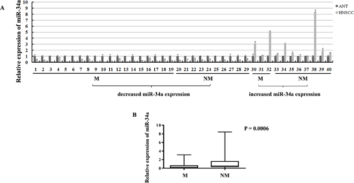 Figure 1: The expressions of miR-34a in HNSCC samples. (A) The relative expressions of miR-34a in NHSCC tumors and the adjacent normal epithelial tissues. (M, lymph node metastatic samples; NM, non-metastatic samples). (B) The relative expressions of miR-34a in metastatic samples were significantly lower than that in non-metastatic samples.