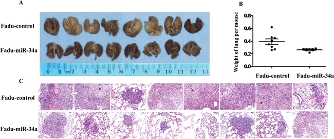 Figure 3: MiR-34a reduced metastatic potential of HNSCC cells in vivo. (A) The macroscopy of metastasis nodes induced by Fadu-miR-34a and Fadu-control in the lung of nude mice. (B) The weights of mice lungs with metastasis nodes induced by Fadu-miR-34a and control cells (p < 0.01). (C) The histopathology of metastases induced by Fadu-miR-34a and Fadu-control in lung tissues with HE staining (Original magnifications × 100). *necrotic area.