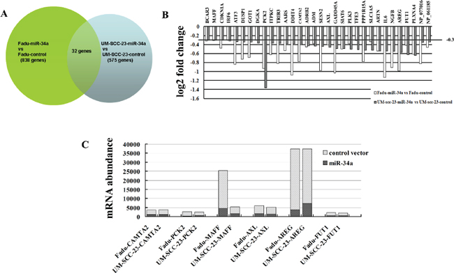 Figure 4: Identification of genes transcriptionally regulated by miR-34a through microarray analysis. (A) Venn diagram of miR-34a mediated changes in genome wide mRNA expression. The overlap field showed the co-down-regulated genes. (B) Histogram showing co-down-regulated genes in mRNA levels after stable transfection ectopic pri-miR-34a in Fadu and UM-SCC-23 cells. Genes with a fold change log2 ≤ –0.3 were considered. (C) mRNA abundance of the candidate targets of miR-34a was detected by microarray analysis.