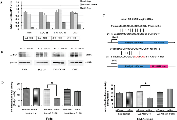 Figure 5: AREG was identified as a direct target of miR-34a. (A) AREG-transcript levels had a generally reduction in HNSCC cell lines with ectopic miR-34a expression. (B) The reduction of AREG protein amounts in miR-34a over-expression cell lines. (C) The 3’-UTR sequence of AREG and the mutant AREG 3’-UTR sequence were cloned into pSiCheck™-2 firefly luciferase vector. (D) Forced expression of miR-34a reduced the luciferase reporter activity of pSiCheck™-2-AREG 3’-UTR (p < 0.01), while had a minimal effect on pSiCheck™-2-AREG-mutant 3’-UTR.