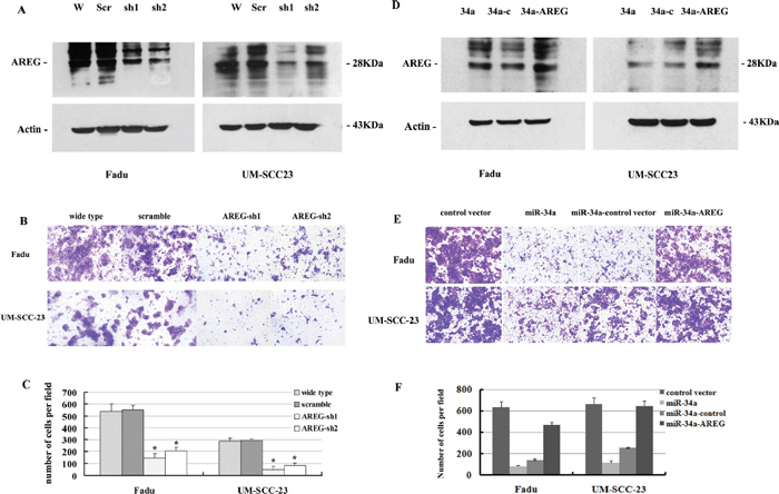 Figure 6: (A) Attenuated AREG protein expression by AREG mRNA knocking down. (B, C) Inhibition of AREG expression impaired HNSCC cell invasion in vitro. (D) Increased AREG protein expression by over-expression of AREG mRNA level. (E, F) Re-expression of AREG partially rescues miR-34a-imposed cell invasion defects in vitro.