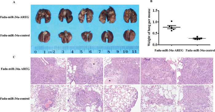 Fadu cells infected with lentiviruses carrying control vector or miR-34a expression construct, or miR-34a-AREG expression construct were used for vivo pulmonary metastasis assays. 6–8 weeks old female BALB\c-nu nude mice (animal experiment center, Wuhan University, China) were injected with 1 × 106 cells (resuspended in 100 μL PBS) via the tail vein. Eight weeks after the injection, the mice were sacrificed and the lung tissues were isolated. Metastasis was quantified by evaluating the weights of lung tissues. The lung tissues were made into serial sections before HE staining. The pathological changes were observed under a light microscope. Mice were manipulated and housed in accordance with the Guide for the Care and Use of Laboratory Animals (Ministry of Science and Technology of China, 2006), and were approved by the animal ethics committee of Wuhan University. All efforts were made to minimize suffering.