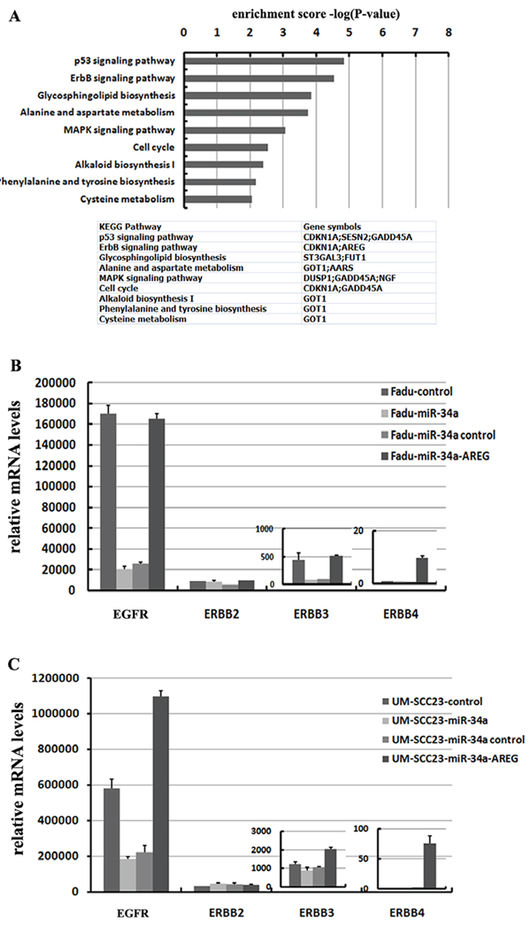 Figure 8: miR-34a involves in ErbB pathway though suppressing AREG. (A) 32 co-down-regulated mRNAs with log2 fold change ≤ –0.3, were subjected to KEGG pathway enrichment analysis. (B) Re-expression AREG reversed miR-34a induced EGFR and ErbB3 down-regulation in Fadu cell lines. (C) Re-expression AREG reversed miR-34a induced EGFR down-regulation in UM-SCC-23 cell lines.