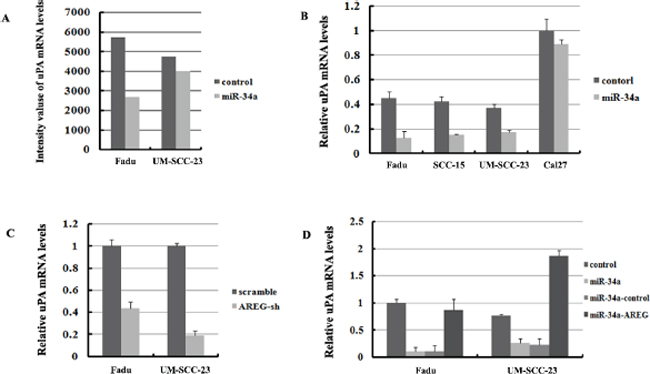 Figure 9: UPA is regulated by miR-34a though inhibition of AREG. (A) mRNA abundance of uPA detected by microarray analysis. (B) The relative expression of uPA mRNA were detected by qRT-PCR in four HNSCC cell lines. (C) Inhibition of AREG expression significantly suppressed uPA mRNA level. (D) Forced AREG expression rescued the uPA mRNA level.