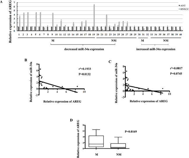 Expression of AREG is partially inversely correlated with miR-34a in HNSCC samples and associated with metastatic phenotypes
