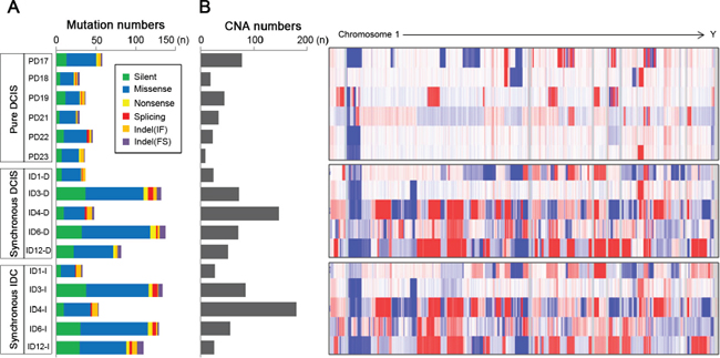 Figure 1: Abundance of somatic mutations and copy number alterations (CNAs) in 6 pure DCIS, 5 synchronous DCIS and 5 synchronous IDC genomes. (A) The numbers of somatic mutations are shown for the 6 pure DCIS (top) (PD17, PD18, PD19, PD21, PD22 and PD23), 5 synchronous DCIS (middle) (ID1-D, ID3-D, ID4-D, ID6-D and ID12-D) and 5 synchronous IDC (bottom) (ID1-I, ID3-I, ID4-I, ID6-I and ID12-I) genomes with respect to the 6 categories (insets). (B) The numbers of copy number alterations (CNAs) with log2 ratios of > 0.3 or < −0.3 together with genome-wide heatmaps of probe-level intensities (log2 ratios) are shown. (blue: gain, red: loss).