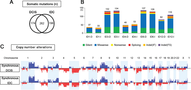 Figure 2: Genomic similarities of synchronous DCIS and IDC. (A) Overlapping somatic mutations between synchronous DCIS and IDC that share 243 identical somatic variants. (B) Comparison of numbers and categories of somatic mutations between synchronous DCIS and IDC. (C) Net frequency plots of copy number alterations across whole chromosomes for the synchronous DCIS (n = 5) and IDC (n = 5).