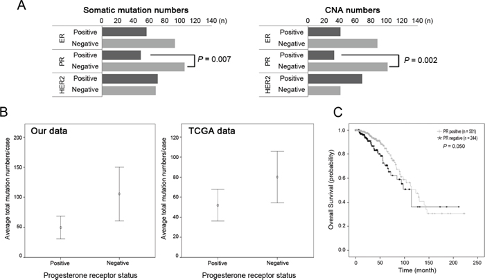 Figure 5: Somatic mutations and copy number alterations according to the receptor status. (A) The PR-negative group harbored significantly more mutations and copy number alterations (CNAs) than the PR-positive group (p = 0.007 and p = 0.002, respectively). (B) Similar distribution of the higher mutation numbers in PR-negative group in the TCGA data (p = 1.47 × 10−17). (C) Survival analysis of PR-positive and PR-negative group in the TCGA data. PR-negative group showed worse prognosis than PR-positive group (p = 0.050).