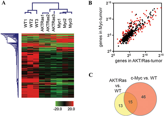 Figure 1: c-Myc and AKT/Ras induced liver tumors exhibit distinct miRNA profiles. (A) Unsupervised hierarchical clustering analysis using 599 mouse miRNAs in normal livers from wild-type (WT) mice and liver tumors from c-Myc and AKT/Ras injected mice. (B) Scattering Plot of miRNAs in liver tumors from c-Myc and AKT/Ras injected mice. Red spots refer to miRNAs with significant difference (unpaired t-test, p < 0.05) between c-Myc and AKT/Ras injected mice. (C) Venn Diagram analysis of c-Myc signature and AKT/Ras signature. The signature was obtained from the miRNA profiling comparison of c-Myc-tumor (or AKT/Ras tumor) and non-tumor liver from wild-type mice. Unpaired t-test was used and miRNAs with p-value < 0.001 and fold change ≥ 2 or ≤ 0.5 were included in the signature.