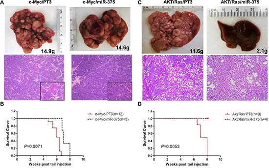 Figure 4: Overexpression of miR-375 strongly inhibits AKT/Ras but not c-Myc induced liver tumor formation in mice. (A) Macroscopic (upper panel) and microscopic (lower panel) appearance of livers from c-Myc/pT3 mice and c-Myc/miR-375 mice stained with H&E (100X), insets (400X). (B) Kaplan Meier survival curve of c-Myc/pT3 and c-Myc/miR-375 mouse cohort. (C) Macroscopic (upper panel) and microscopic (lower panel) appearance of livers from AKT/Ras/PT3 mice and AKT/Ras/miR-375 mice stained with H&E (100X). (D) Kaplan Meier survival curve of AKT/Ras/pT3 and AKT/Ras/miR-375 mouse cohort.