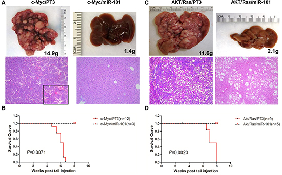 Figure 5: Overexpression of miR-101 efficiently inhibits c-Myc and AKT/Ras induced liver tumor development. (A) Macroscopic (upper panel) and microscopic (lower panel) appearance of livers from c-Myc/pT3 mice and c-Myc/miR-101 mice stained with H&E (100X), insets (400 X). (B) Kaplan Meier survival curve of c-Myc/pT3 and c-Myc/miR-101 mouse cohort. (C) Macroscopic (upper panel) and microscopic (lower panel) appearance of livers from AKT/Ras/PT3 mice and AKT/Ras/miR-101 mice stained with H&E (100X). (D) Kaplan Meier survival curve of AKT/Ras/pT3 and AKT/Ras/miR-101 mouse cohort.