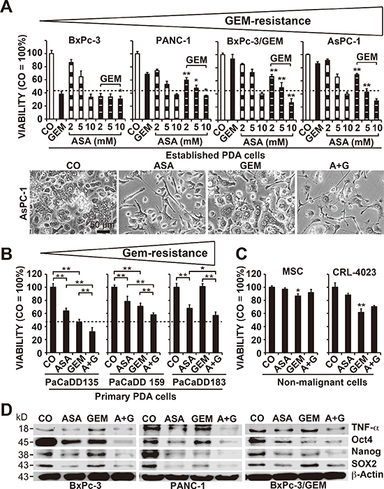 Figure 1: Aspirin overcomes gemcitabine resistance and alters the expression of reprogramming factors. (A) The human established PDA cell lines BxPc-3, PANC-1, BxPC-3/GEM and AsPC-1 were left untreated (CO) or were treated with 2, 5, or 10 mM aspirin (ASA), 50 nM gemcitabine (GEM), or both together, and the cellular viability was measured 72 h later with an MTT assay. The gemcitabine resistance of the cells is indicated by a triangle above the diagrams. The morphology of AsPC-1 cells 72 h after treatment was documented by microscopy at 200× magnification. Representative pictures are shown, and the bar indicates 50 μm. (B) The primary, low-passage human PDA cell lines PaCaDD183, PaCaDD159 and PaCaDD135 or (C) human MSCs and non-malignant, immortalized human pancreatic ductal cells (CRL-4023) were treated and analyzed as described above. (D) BxPc-3, PANC-1 and BxPc-3/GEM cells were treated as described above, and after 48 h, expression of the aspirin target and pro-inflammatory factor TNF-α and expression of the re-programming factors Oct-4, Nanog and SOX2 were measured by Western blot analysis. β-Actin served as a control. The data are presented as means ± SD (**P < 0.01, *P < 0.05).