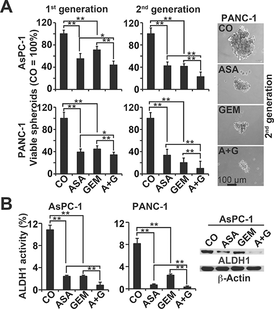 Figure 3: Aspirin inhibits spheroid formation and ALDH1 activity and enhances gemcitabine efficacy. (A) AsPC-1 and PANC-1 cells were seeded at a clonal density (1.0–2.0 × 103 cells/mL) in ultra-low attachment plates with serum-free, but growth factor-containing, medium for spheroid formation. Forty-eight hours later, the cells were treated as described, and then 72 h later, the percentage of viable spheroids was determined (1st Gen). The number of spheroids in the control was set to 100%. Thereafter, 1st Gen spheroids were dissociated to single cells, and equal numbers of live cells were re-plated at a concentration of 1.0–2.0 × 103 cells/mL. Upon spheroid formation 72 h later, the cells were photographed at 100× magnification (left images) and quantified as described above (2nd Gen). The bar indicates 100 μm. (B) AsPC-1 and PANC-1 cells were treated as described above, and 48 h later, ALDH1 activity was analysed using a substrate assay and flow cytometry. Western blot analysis of ALDH1 protein expression in AsPC-1 cells 48 h after treatment is shown on the left. The data are presented as means ± SD (**P < 0.01, *P < 0.05).