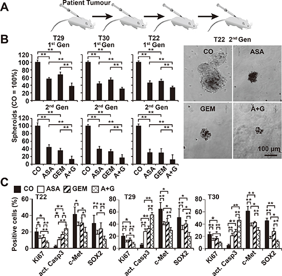 Figure 4: Aspirin inhibits the development of primary CSC spheroids and enhances gemcitabine efficacy. (A) Primary pancreatic CSCs were selected by serial transplantation of freshly resected PDA tumor tissues (T29, T30, T22: compare Table 1) to immunodeficient mice, followed by in vitro culture on ultra-low attachment plates at a low density of 1–2 × 104 cells/mL in serum-free, but growth factor-containing, medium for spheroid formation. (B) One week after culturing in vitro, the spheroids were treated as described. Five days later, the percentage of viable spheroids was determined (1st Gen). The number of spheroids in the control was set to 100%. Representative photographs from T22 spheroids 5 days after treatment at 100× magnification are shown at the right. The bar indicates 100 μm. (C) Cells from treated primary spheroids were collected on microscope slides by cytospin centrifugation. Expression of the proliferation marker Ki67, the apoptosis marker “cleaved, active fragment of caspase-3” (act. Casp3), and the CSC markers c-Met and SOX2 was examined by immunohistochemistry. The number of positive cells was quantified in 10 visual fields at 400× magnification, and the means ± SD are shown in the diagrams (**P < 0.01, *P < 0.05).