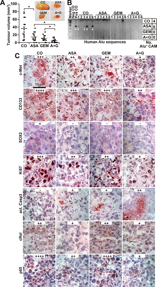 The in vivo relevance of these data was examined by xenotransplantation of PANC-1 cells onto the CAM of fertilized chick eggs on developmental day 11 followed by in ovo treatment with aspirin on days 11, 13, 15 and 17 and gemcitabine treatment on days 11 and 15. The xenografts were resected on day 18. Whereas aspirin and gemcitabine alone significantly reduced the tumor volume, treatment with both in combination nearly completely prevented tumor formation (Figure 5A). To evaluate the invasion potential, genomic DNA was prepared from the CAM surrounding the tumor xenograft and from liver and lung tissue. Human Alu sequences, reflecting the presence of invading and metastasizing human cells, were detected by PCR. Whereas 4 of 6 CAM tissues from untreated eggs were Alu-positive, none of the tissues from the aspirin- or gemcitabine-treated groups were positive (Figure 5B). Alu sequences were not detectable in the liver or lung in any group, indicating that the xenografts did not spread to other organs (Figure S4A). In addition, we observed neither significant change in body weight of the embryos nor liver necrosis or developmental effects, indicating that the treatment was well tolerated (Figure S4B, S4C). Immunohistochemical staining for c-Met, CD133, SOX2, Ki67, cleaved fragment of caspase-3, p65 and c-Rel indicated that both single treatments reduced the proliferation and the expression of CSC markers and NF-κB subunits and induced apoptosis, although the combination treatment was most effective (Figure 5C); these findings were confirmed by immunofluorescence-double staining of the CSC markers EpCAM and Ki67 (Figure S4D).