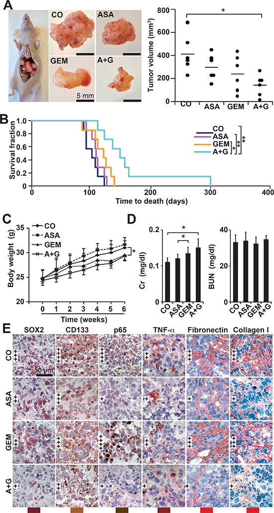 To further confirm these data, we xenotransplanted PANC-1 cells orthotopically to the pancreas of immunodeficient mice followed by treatment with aspirin or gemcitabine. Aspirin was used in a dose of 200 mg/kg, according to a publication, in which the same concentration was successfully used for the treatment of mice with orthotopically growing PANC-1 xenografts [30]. The administration of aspirin or gemcitabine alone decreased tumor growth, but the combination of both agents significantly inhibited tumor formation (Figure 6A). These results are reflected by the survival time of mice of each group, which was significantly longer in the combination group (Figure 6B). Also, there was a significant longer survival of gemcitabine-treated mice upon co-treatment with aspirin. No macroscopic metastases were detected in the livers and lungs, but we observed two mice in the control group and one mouse in the gemcitabine group with celiac implantation metastasis, while no metastases were detected in the aspirin and combination groups (data not shown). While aspirin had no obvious side effects, as evident from measures of body weight, plasma creatinine and urea nitrogen, gemcitabine alone or combined with aspirin significantly reduced the body weight and increased the plasma creatinine levels (Figure 6C, 6D). In contrast, liver necrosis was not induced by any treatment (Figure S5). Immunohistochemical staining of xenograft tissue from treated mice revealed a reduction in SOX2, CD133, p65 and TNF-α, as well as the ECM components fibronectin and collagen, and more pronounced effects were observed following combination treatment (Figure 6E).