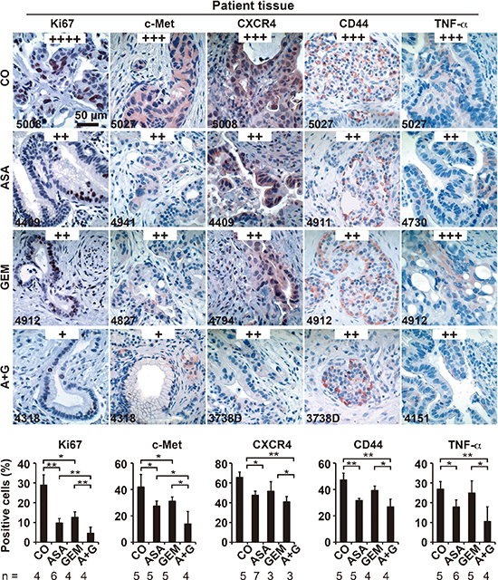 Figure 7: Aspirin intake before surgery inhibits the expression of progression markers in PDA patient tissue. Tumor tissue sections derived from patients with documented pre-operative administration of aspirin (n = 7), gemcitabine (n = 5), aspirin plus gemcitabine (n = 3), or neither aspirin nor gemcitabine (n = 6) were evaluated by immunohistochemistry for the expression of the proliferation marker Ki67, the inflammatory factor TNF-α, and the CSC markers c-Met, CD44 and CXCR4. The scale bar indicates 50 μm. The number of positive cells was quantified in 10 visual fields at 400× magnification, and the means ± SD are shown in the diagrams. The data are presented as means ± SD (**P < 0.01, *P < 0.05).