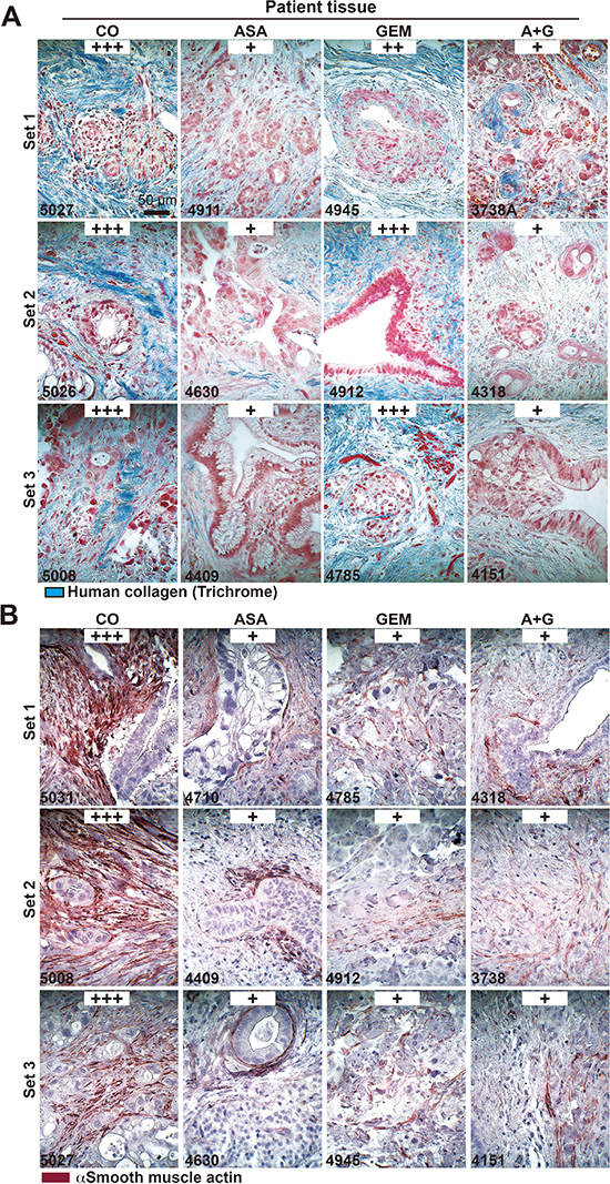 Figure 8: Aspirin intake before surgery reduces desmoplasia in patient tissues. (A) The patient tissue described in Figure 6 was stained with trichrome to detect deposits of human collagen (blue) embedded between tumor cells (red). The scale bar indicates 50 μm. (B) Likewise, the above patient tissue was stained with an anti αSMA antibody for the detection of activated stellate cells (red). The scale bar indicates 50 μm. The intensity of collagen deposits or αSMA expression was evaluated as described in Figure 5C.
