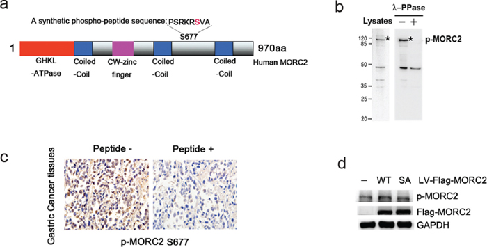 In this study, we used a phosphorylation state-specific antibody raised against phospho-MORC2 Ser677 to confirm the phosphorylation of MORC2 in vivo. The phospho-MORC2 Ser677 antibody was produced by immunizing animals with a synthetic phospho-peptide corresponding to residues surrounding Ser677 of human MORC2 (NM-014941.1), which had not share the identical (-PSRKRSVA) sequences with other MORC protein family. The specificity and reactivity of the antibody were verified by a series of assays. Thus, our findings provide important evidence to show the role of MORC2 phosphorylation in gastric cancer in vivo.