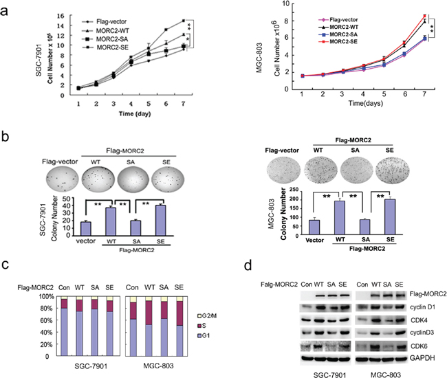 Figure 3: Phosphorylation of MORC2 at Ser-677 promotes gastric cell proliferation and cell cycle progression. (A and B) MORC2 Phosphorylation promotes gastric cell proliferation. (A) The stable expressing lentivirus-mediated Flag-MORC2 SGC-7901 and MGC-803 cells grown for 2,4 or 6 days and analyzed for cell growth by cell counts assay. Values are the means ± SD from three individual experiments. (B) Colony formation assays were performed with the lentivirus-mediated stable expressing of Flag-MORC2 SGC-7901 and MGC-803 cells. Representative results are shown. (C–D) Phosphorylation of MORC2 promotes cells transition from G1 to S. (C) The lentivirus-mediated stable expressing of Flag-MORC2 of SGC-7901 and MGC-803 cells were cultured and stained with propidum iodide. Cell cycle distribution was measured by FACS. Values are the means ± SD from three individual experiments. The average percents of three experiments were showed in histogram. (D) The levels of these proteins controlling cell cycle were detected by Western blotting in the lentivirus-mediated stable expressing of Flag-MORC2 SGC-7901 and MGC-803 cells. The lysates were probed with indicated antibodies.